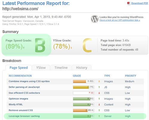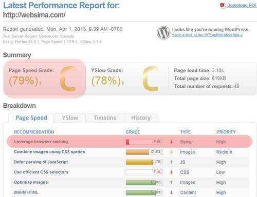 با استفاده از حافظه کش مرورگر میتوانید بعضی از این فایلها را بر روی مرورگر کاربران ذخیره کنید. اولین بازدید کاربران از سایت شما به اندازه واقعی از آنها زمان میگیرد ولی زمانیکه برای بار دوم به سایت شما مراجعه میکنند یا از صفحه ای به صفحه دیگر میروند بخش زیادی از فایل ها را در حافظه کش مرورگر خود دارند. درنتیجه حجم فایل های دانلودی توسط مرورگر و تعداد درخواست های ارسالی به سرور شما کاهش می یابد که موجب افزایش سرعت بارگزاری سایت شما میگردد.
