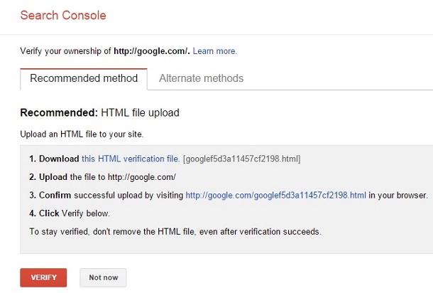 - اولین روش پیشنهادی گوگل استفاده از فایل html ای است که ابتدا می بایست آن را دانلود نموده سپس در دایرکتوری اصلی وب سایت خود بارگذاری نمایید پس از آن دکمه verify که در تصاویر بالا مشاهده می شود را کلیک نمایید. در صورتی که این مراحل بدستی انجام شود پیغامی دریافت خواهید نمود مبنی بر اینکه گوگل تشخیص داده است که شما مالکیت وب سایتی که آدرس آنرا وارد نموده اید را بر عهده دارید و از این پس می توانید از قابلیت های گوگل وبمستر تولز استفاده نمایید.