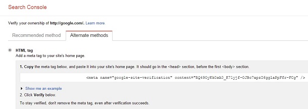 - دومین روش تصدیق گوگل جهت افزودن سایت به گوگل وبمستر تولز استفاده از یک تگ html است. ابتدا می بایست این تگ html را کپی و سپس در قسمت head صفحه اصلی وب سایت خود قرار داده، پس از آن دکمه verify را کلیک نمایید. در شکل زیر این تگ html نمایش داده شده است: